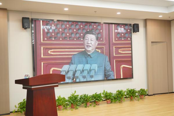 会议室里,全体人员整齐就座,目光聚焦大屏幕。当习近平总书记出席阅兵仪式并发表重要讲话时,现场响起热烈掌声。大家全神贯注观看阅兵全过程,从庄严的升旗仪式到威武雄壮的分列式,展现了中国军队的强大实力和崭新风貌。