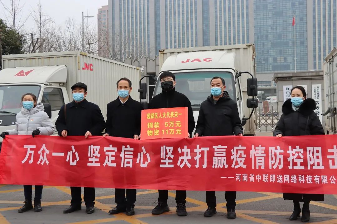 1月14日,魏都区人大、魏都慈善总会联合河南省中联即送网络科技有限公司举行抗疫物资捐赠仪式。区人大常委会主任申健民、 魏都慈善总会会长李忠义、河南省中联即送公司董事长宋一、河南省中联即送公司党支部书记贾芯等出席仪式。