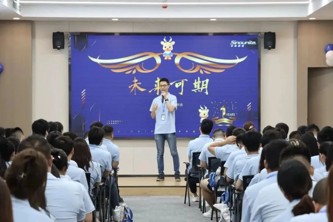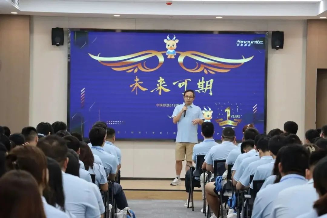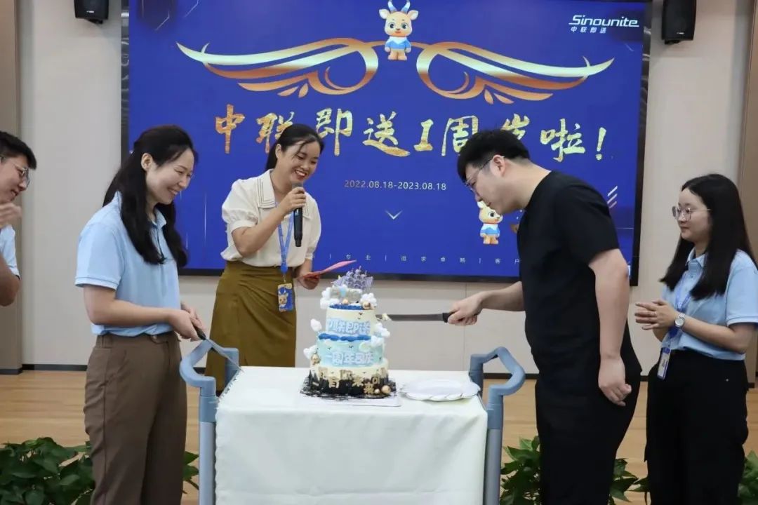 在中联即送一周岁生日庆典的尾声,宋总、真姐与几位寿星上台庆生,全体员工齐唱中联司歌,切下周年蛋糕,许下美好未来。