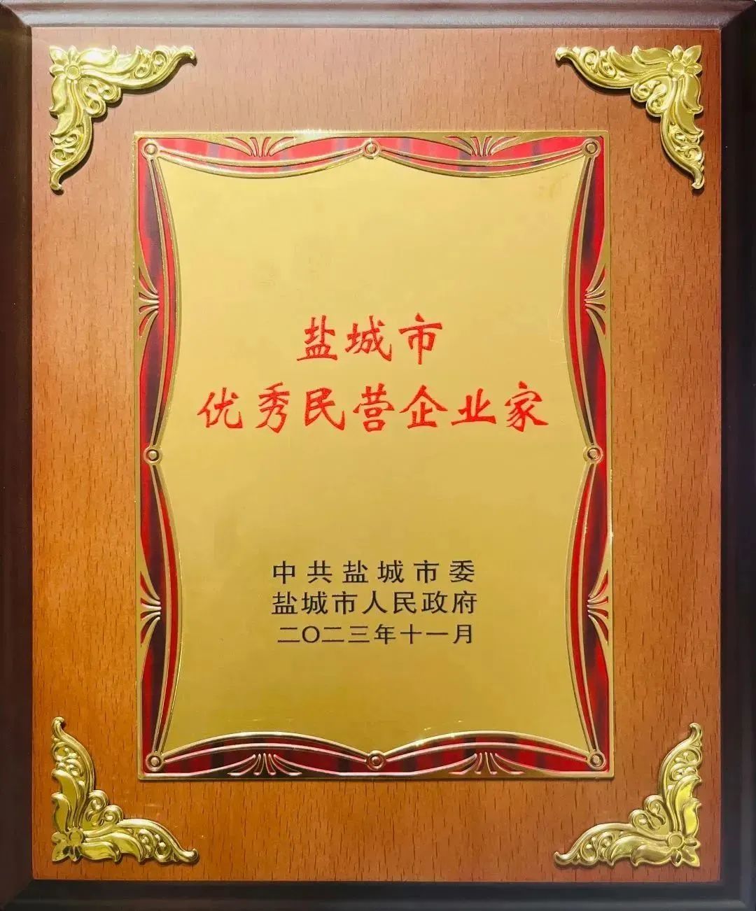 ▲ 董事长“盐城市优秀民营企业家”奖牌